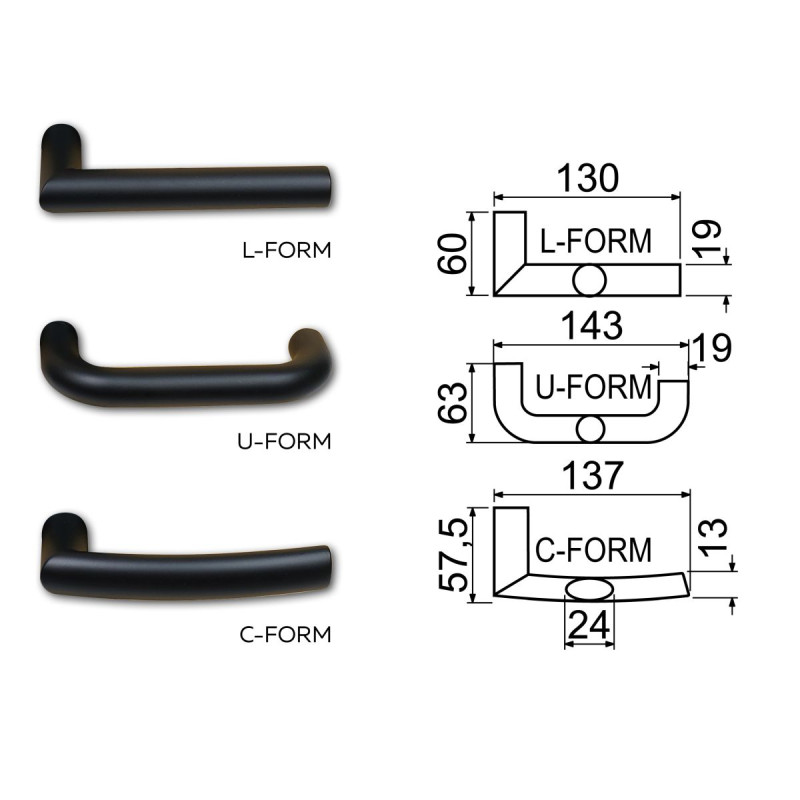 - Štandardná kľučka v tvare „C-FORM“ – na požiadanie možnosť prevedenia L-FORM alebo U-FORM (prosím uveďte do poznámky pri objednávke).