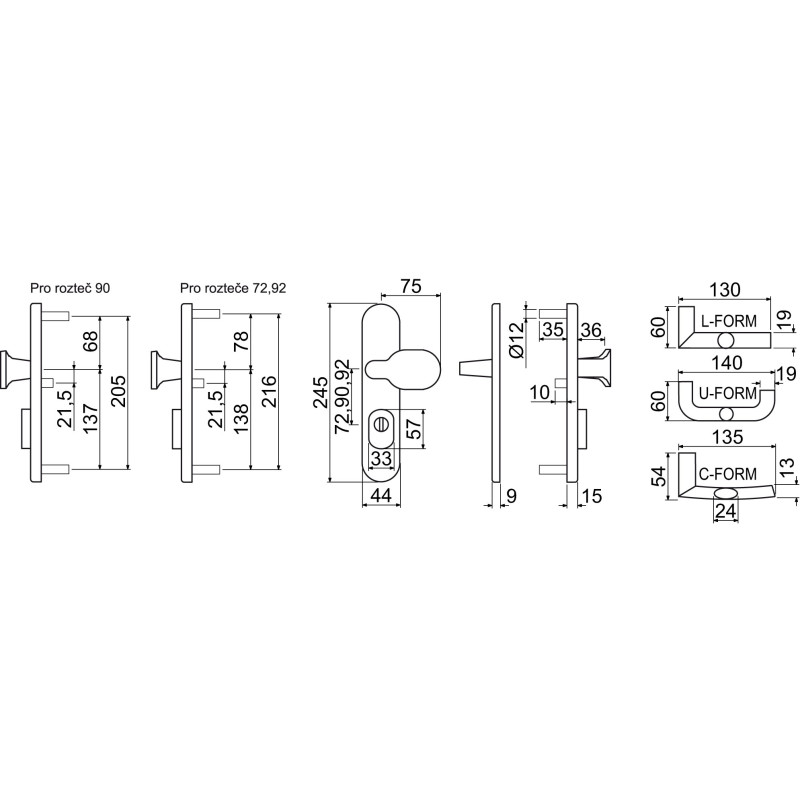 - Rozteč 92 mm: hrúbka dverí 60–75 mm