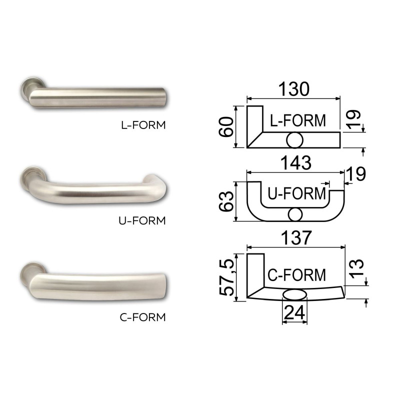 - Štandardná kľučka v tvare „C-FORM“ – na požiadanie možnosť prevedenia L-FORM alebo U-FORM (uveďte prosím do poznámky pri objednávke).