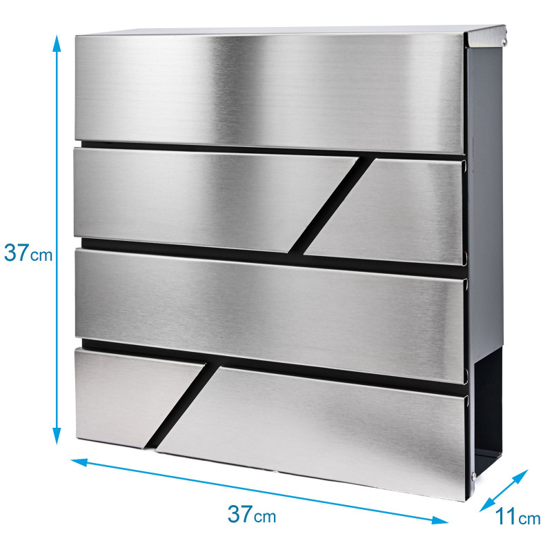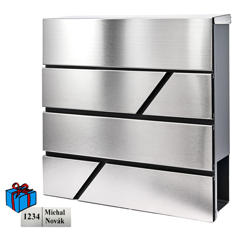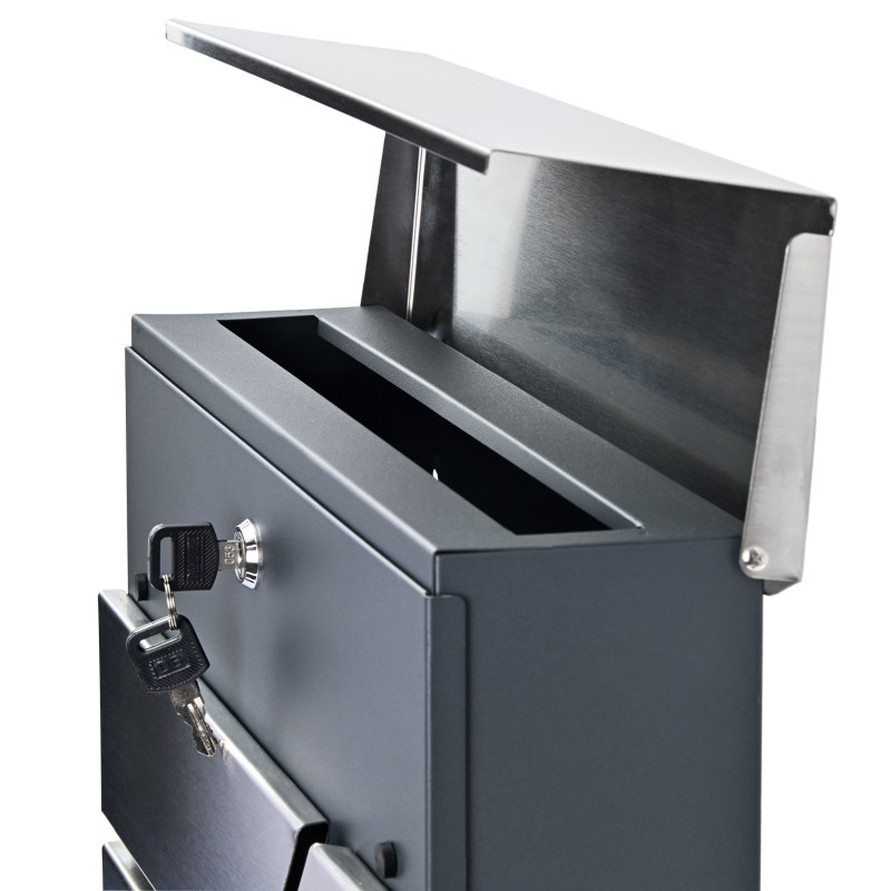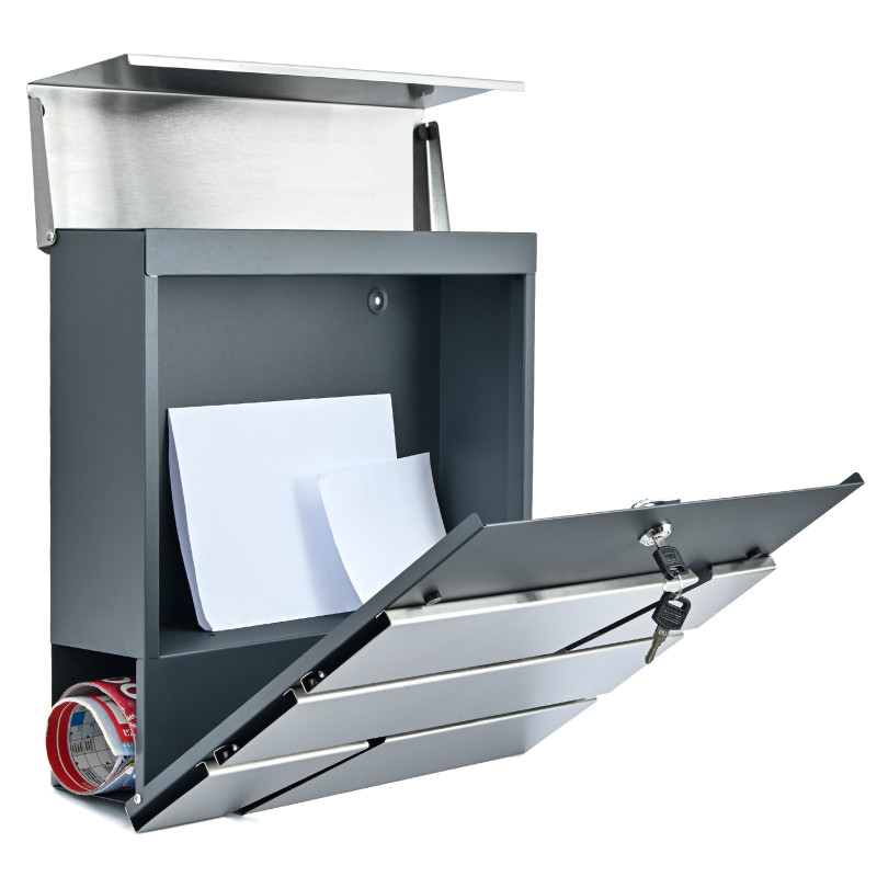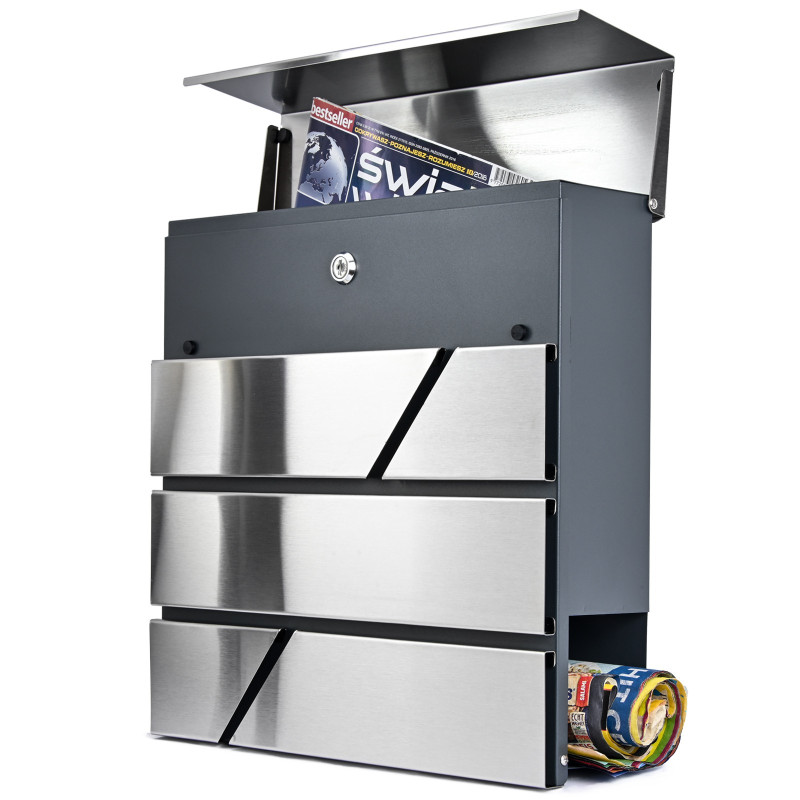 Poštová schránka z kombinovaným povrchom - nerezová oceľ a antracit. Vďaka použitiu vhodného materiálu je box odolná voči poveternostným podmienkam. Bola navrhnutá pre pohodlie používateľa a zohľadňuje súčasné estetické trendy. Vybavené dolným tubusom na noviny a väčšie letáky. Zhora je všetka korešpondencia veľmi dobre chránená pred vlhkosťou a dažďom. Farebná kombinácia nerezu a antracitu.
