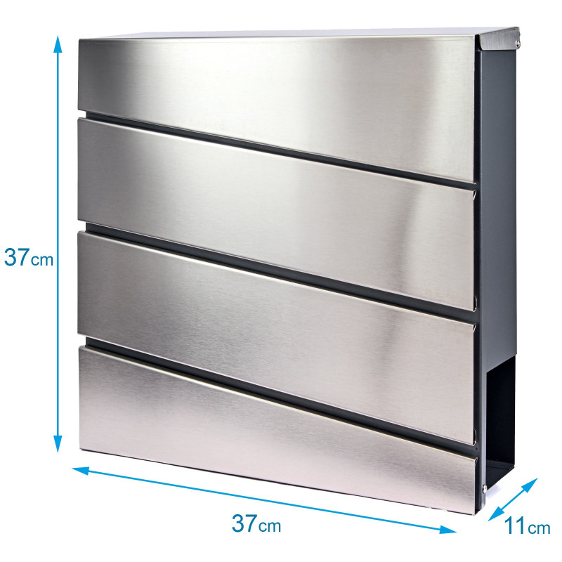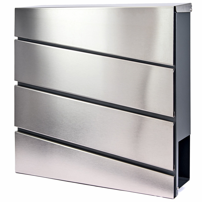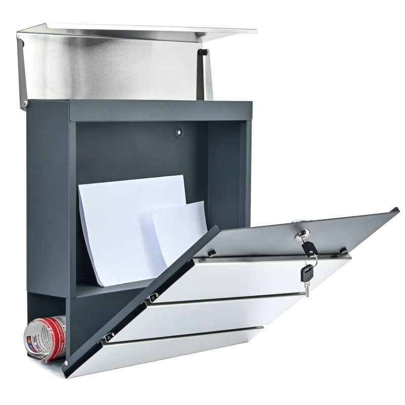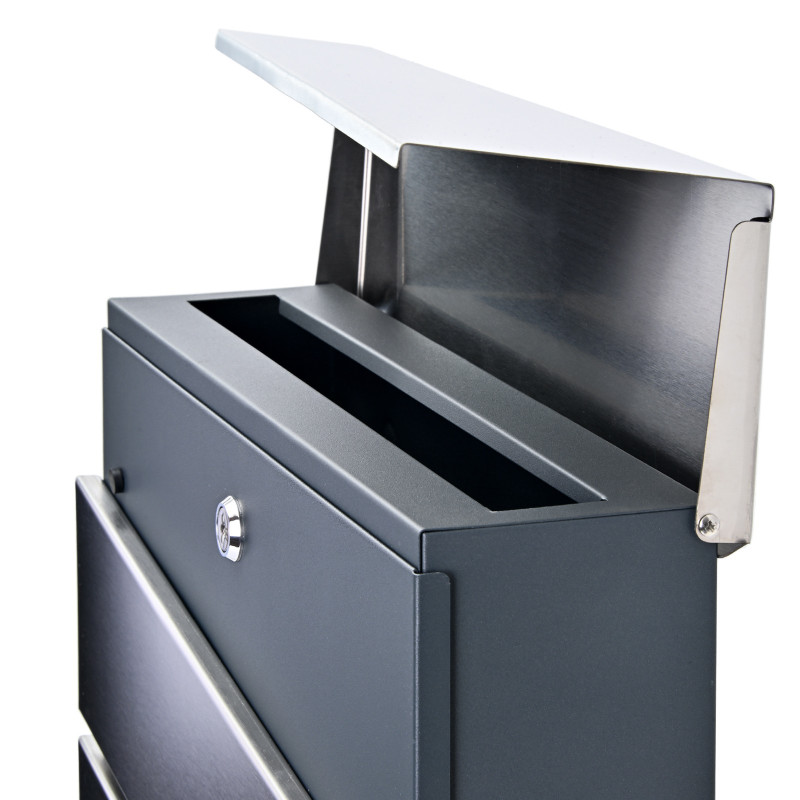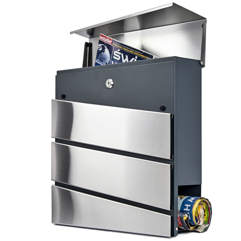 Poštová schránka, kombinácia nerezovej ocele a antracitu. Veľkosť schránky zaručuje bezproblémové prijatie veľkého množstva pošty. Vybavená ďalšou priehradkou na noviny a väčšie letáky. Zhora je všetka korešpondencia chránená pred vlhkosťou. Kombinácia nerezu a antracitu vystihuje momentálny farebný trend okien a plotov. Schránka obsahuje montážne prvky v zadnej časti -  pre ešte rýchlejšiu a ľahšiu montáž.