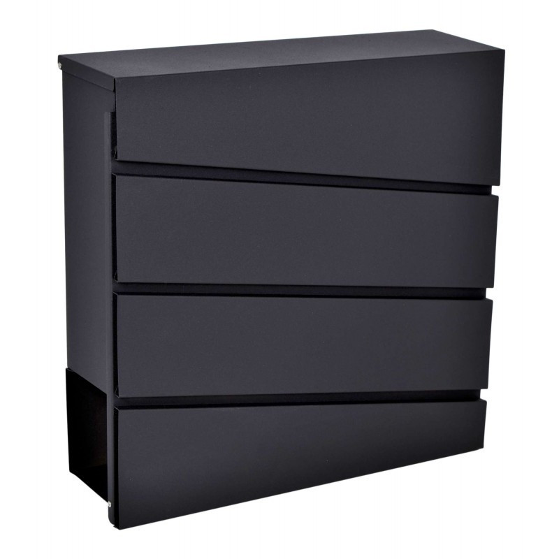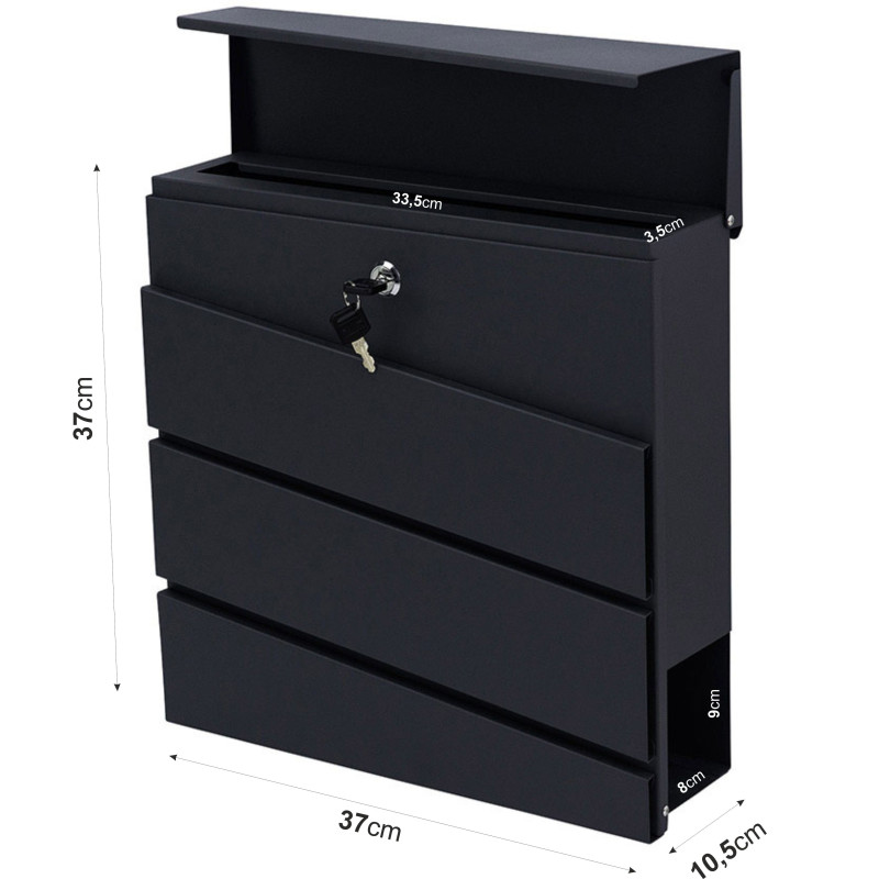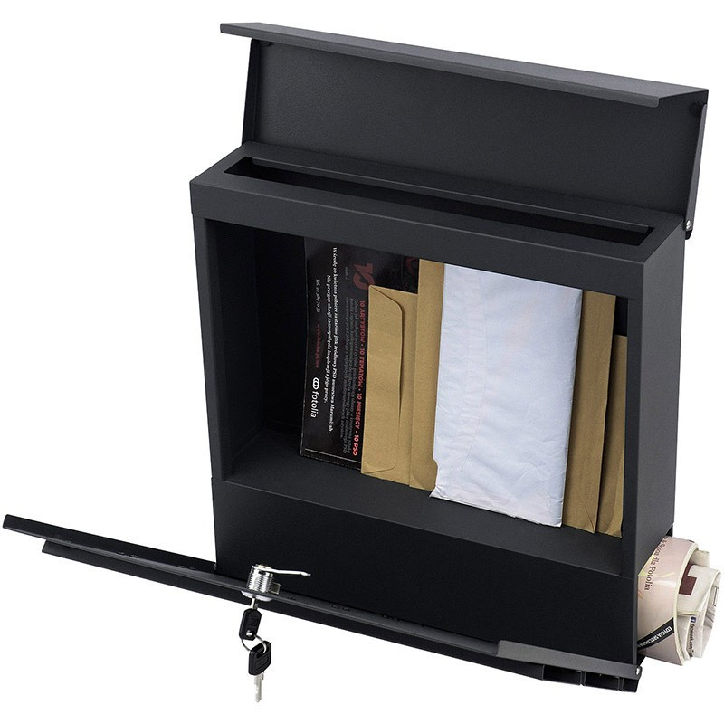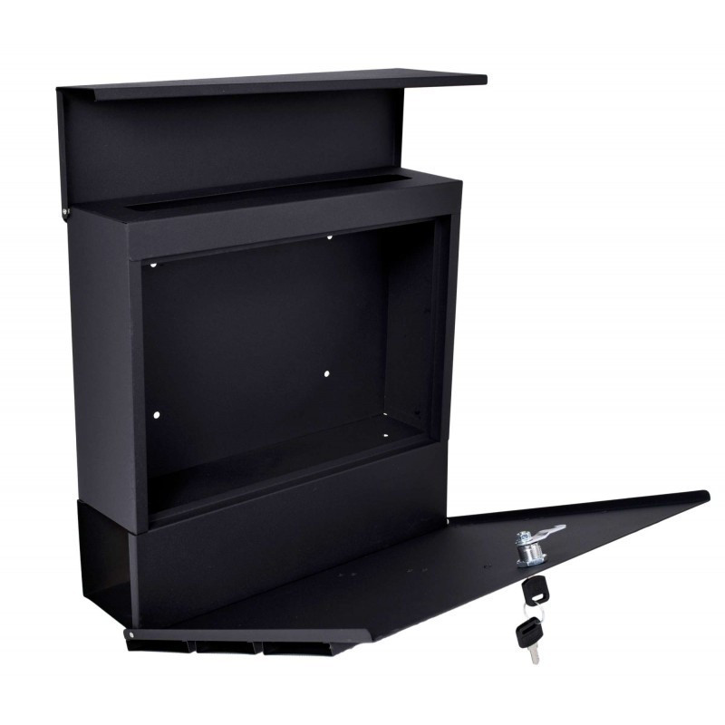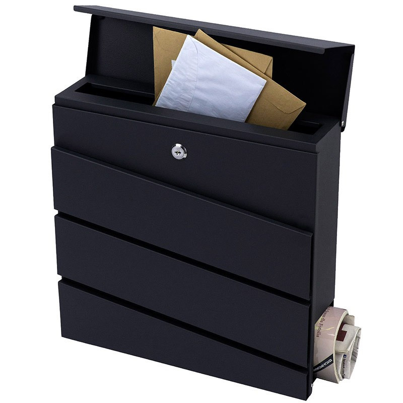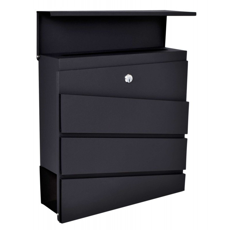 Kvalitná poštová schránka vyrobená z pozinkovanej ocele s práškovým nástrekom v čiernej farbe , vďaka použitému materiálu je schránka je odolná voči poveternostným vplyvom. Bola navrhnutá pre pohodlie užívateľa a s prihliadnutím na súčasné estetické trendy. Obsahuje prídavnú priehradkou na noviny a väčšie letáky. Horný kryt schránky veľmi dobre chráni korešpondenciu aj zámok pred vlhkosťou a dažďom. Sada obsahuje montážne skrutky, pričom otvory sú pripravené na zadnej strane schránky - pre rýchlu a jednoduchú montáž.