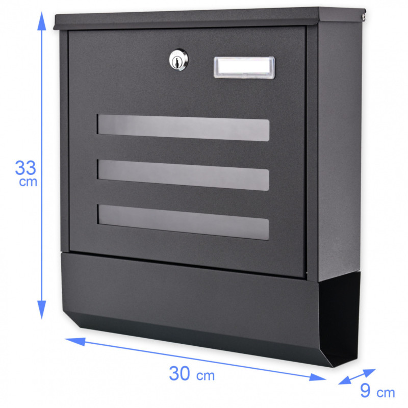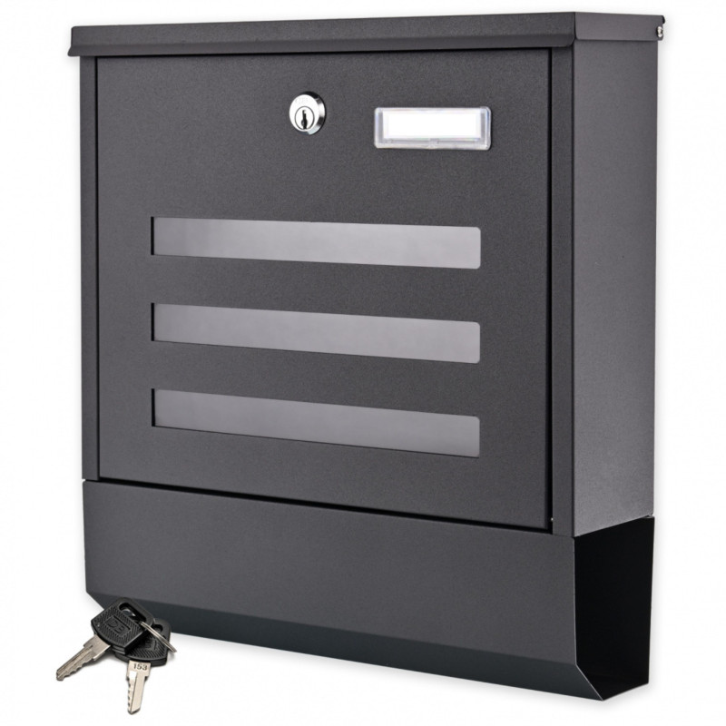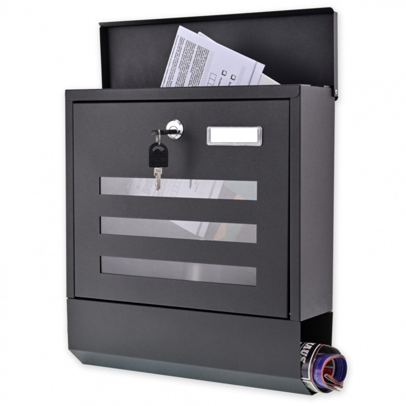 Kvalitná schránka z oceľového plechu v odtieni čierna. Poskytuje pohodlie pre používateľov vďaka navrhnutým 3 pozdĺžnym oknám s možnosťou priehľadu do vnútra schránky. Táto funkcia umožňuje skontrolovať obsah schránky bez toho, aby ste ju museli otvárať zakaždým. Len si skontrolujete prednú časť a nezabudnete si tak vyzdvihnúť svoju poštu. Schránka je vybavená dolným tubusom pre noviny a letáky (často tlačené vo väčšom formáte).