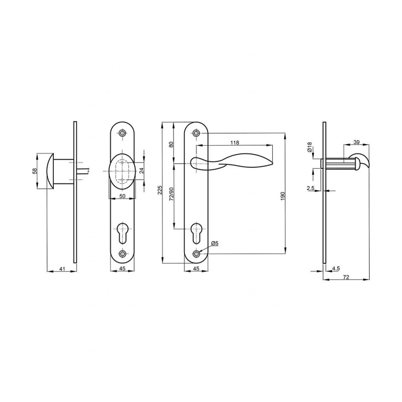 - rozmery: dĺžka štítu 225mm, šírka štítu 44mm, rozteč montážnych otvorov 190mm