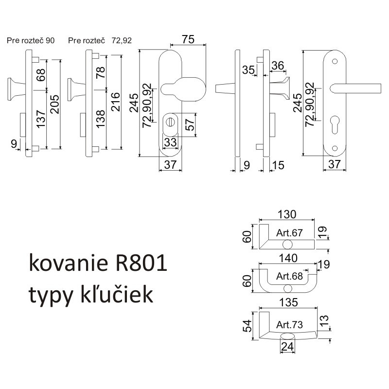 - Rozteč 72, 90, 92 mm /osová vzdialenosť kľučky od vložky/