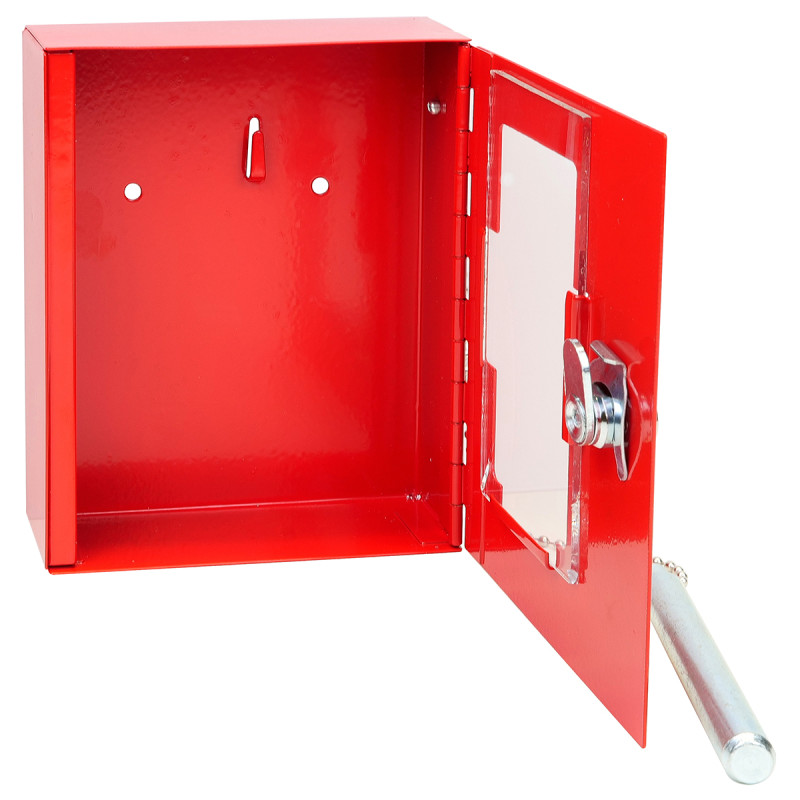 Požiarna oceľová skrinka so sklom a kladivkom na spoločný uzáver - SU. Skrinka je vyrobená z odolnej ocele, predná časť je vybavená sklenenou výplňou, ktorá sa v prípade núdze rozbije pribaleným kladivkom. Takto je možné okamžite a jednoducho získať prístup dnu.