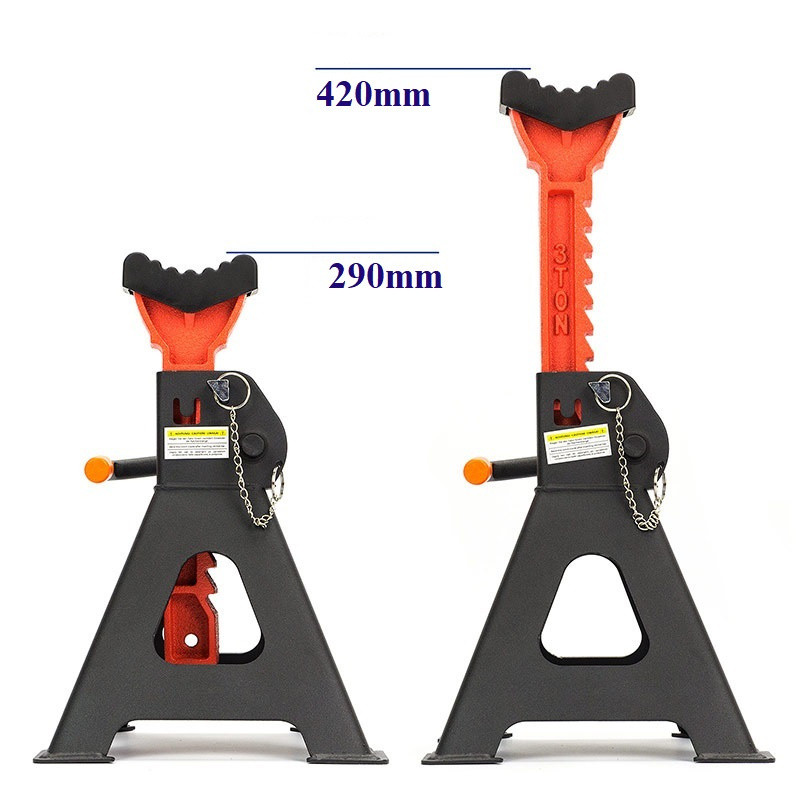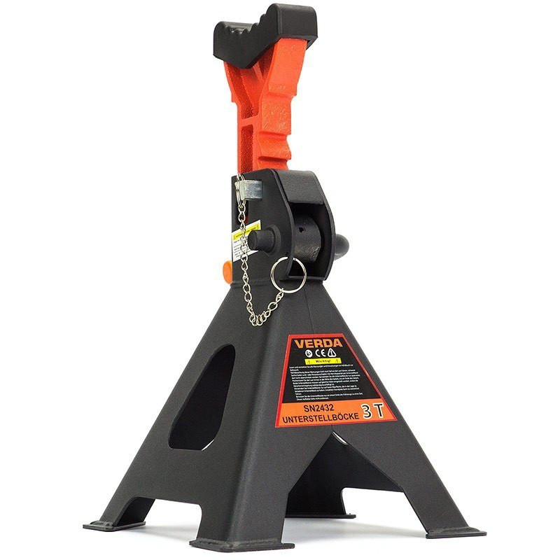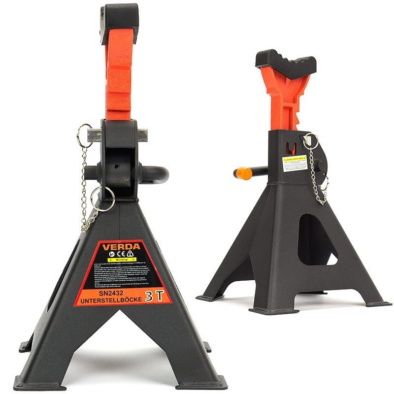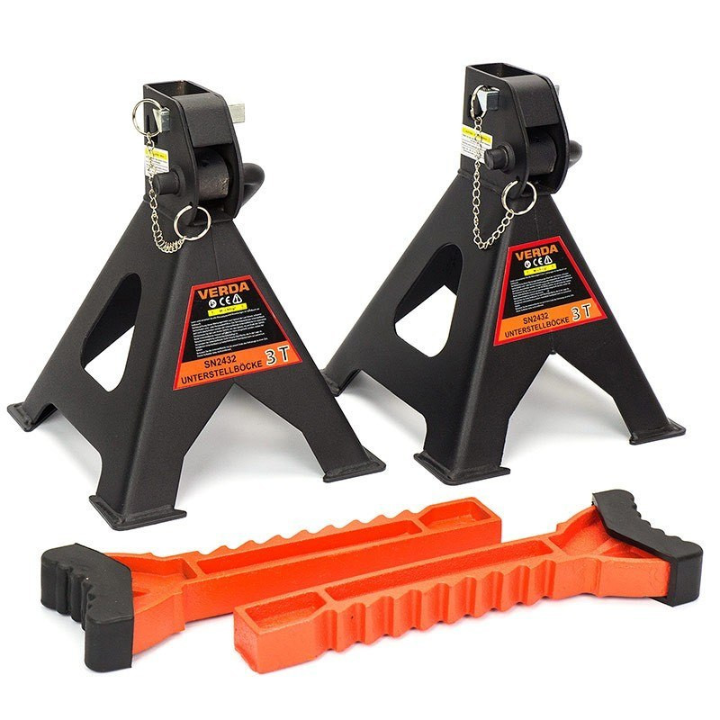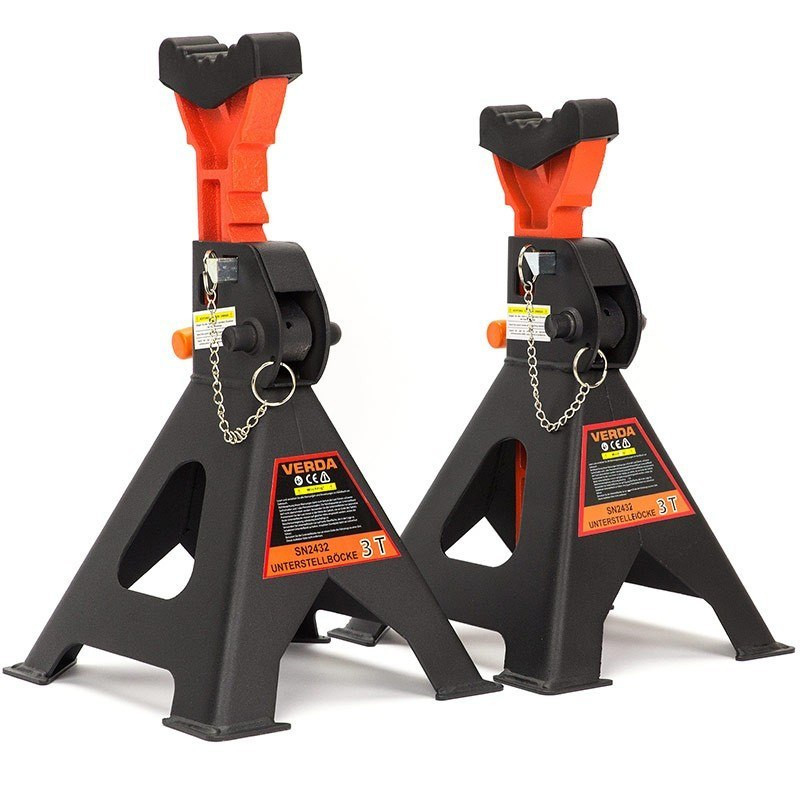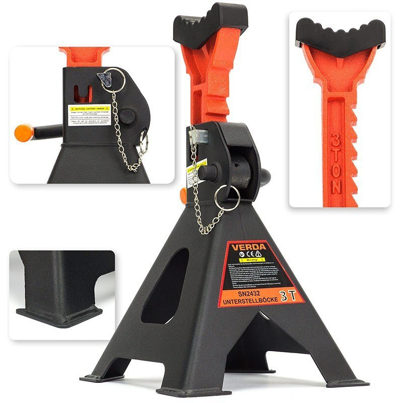 Podpery pod auto 3T SN2432 - sada dvoch podpier s nosnosťou 3 tony, vybavených ochrannou gumou a bezpečnostným kolíkom.