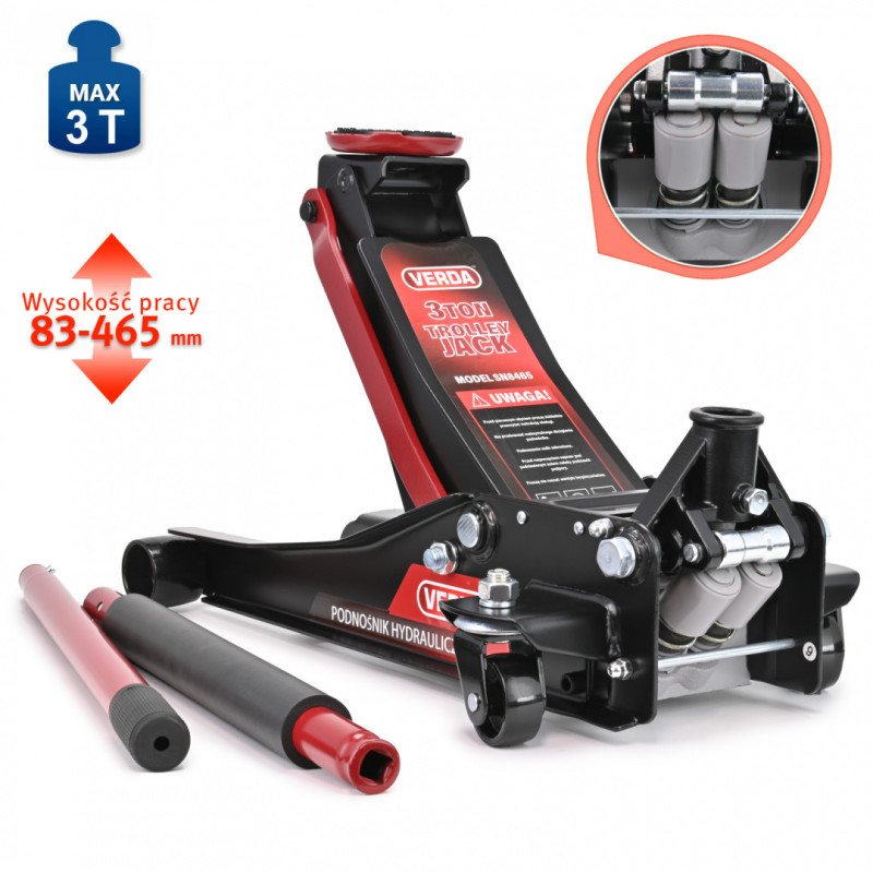 Nízkoprofilový hydraulický zdvihák s nosnosťou 3T, zaručujúci rýchle a bezproblémové zdvíhanie vďaka použitiu 2 piestov
