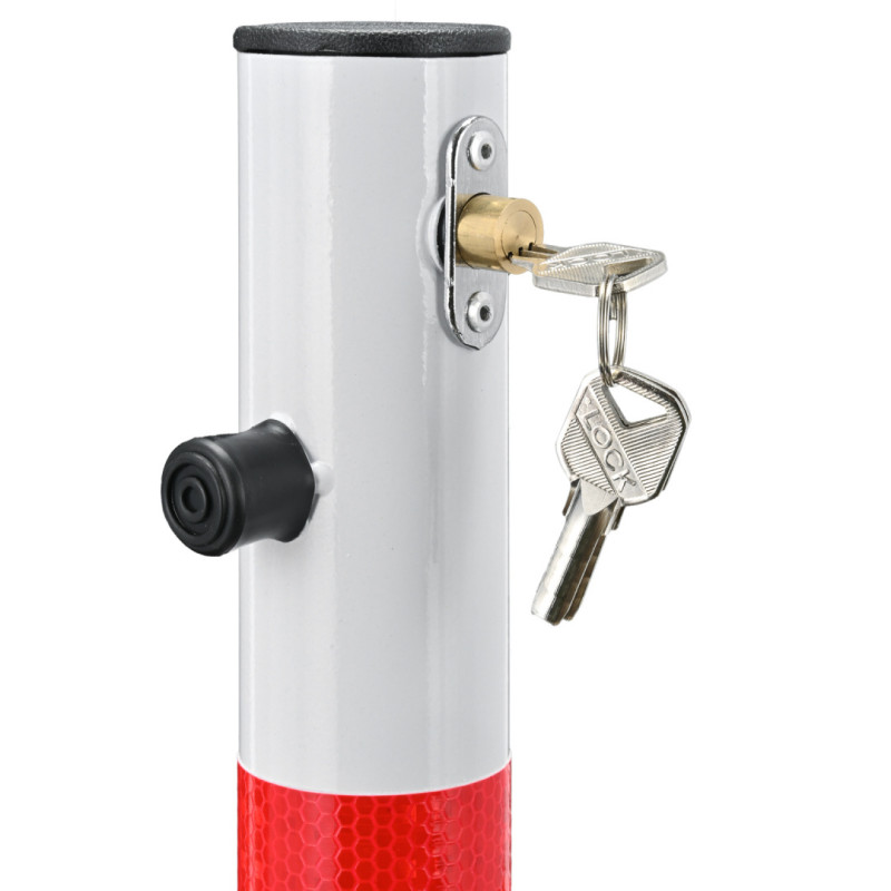 Skladacia okrúhla parkovacia zábrana so zámkom s maximálnou výškou 60 cm. Červené pásiky sú reflexné. Parkovacia blokáda slúži na ochranu a rezerváciu parkovacieho miesta. Je ideálnym riešením pre majiteľov bytov, domov či firemných parkovísk, ktorí chcú mať istotu, že ich miesto nebude neoprávnene obsadené. Vďaka pevnému ukotveniu do zeme a možnosti uzamykania poskytuje spoľahlivú ochranu, pričom jej skladací mechanizmus umožňuje pohodlné a rýchle používanie.